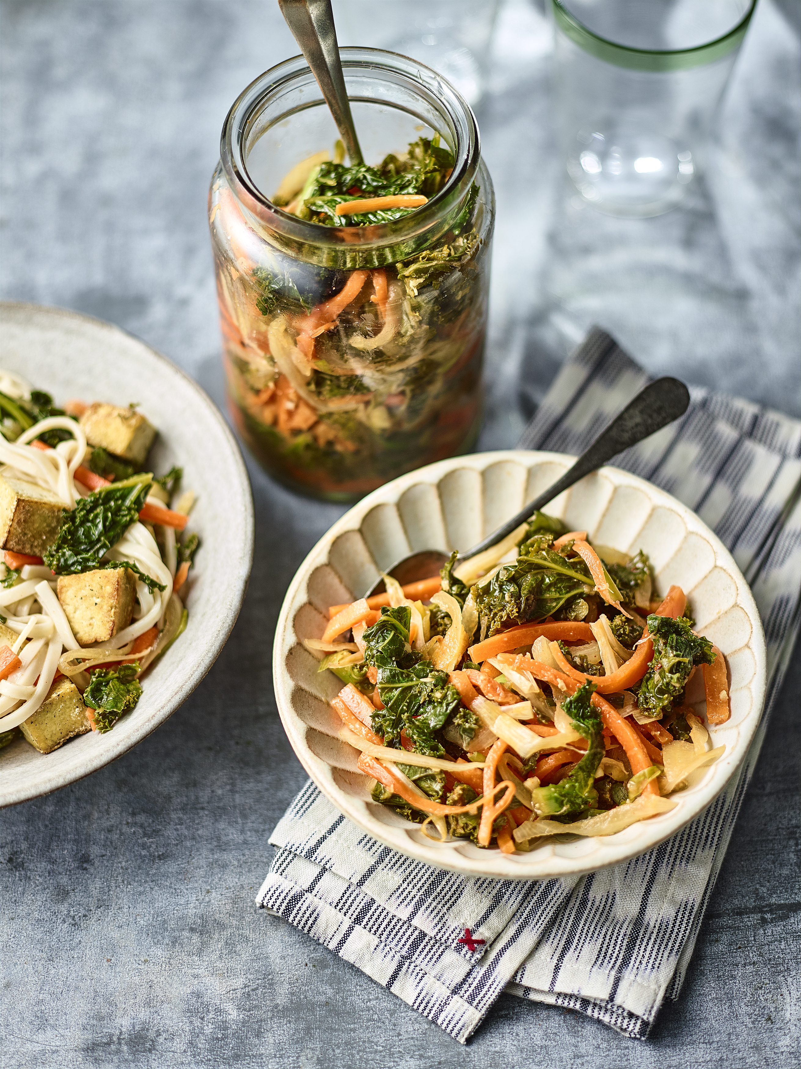 - Place the kale, carrots and onion in a large bowl. Shred the green parts of the spring onions and mix into the kale. Sprinkle over the salt and mix in with clean, dry hands to evenly coat. Leave in the fridge for 6 hours but ideally overnight.